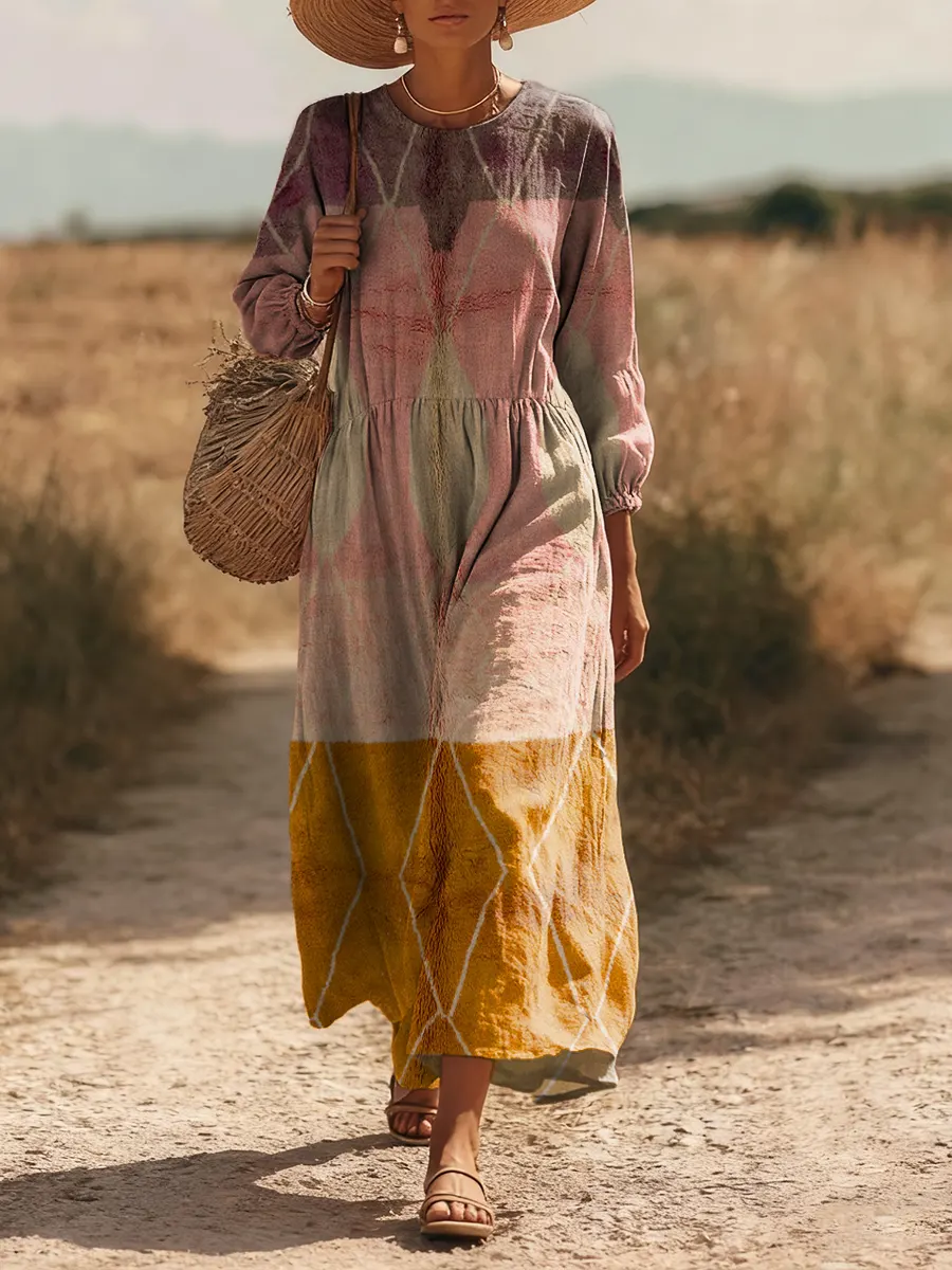 Women's Retro Ethnic Art Print Casual Round Neck Cotton Linen Pocket Dress