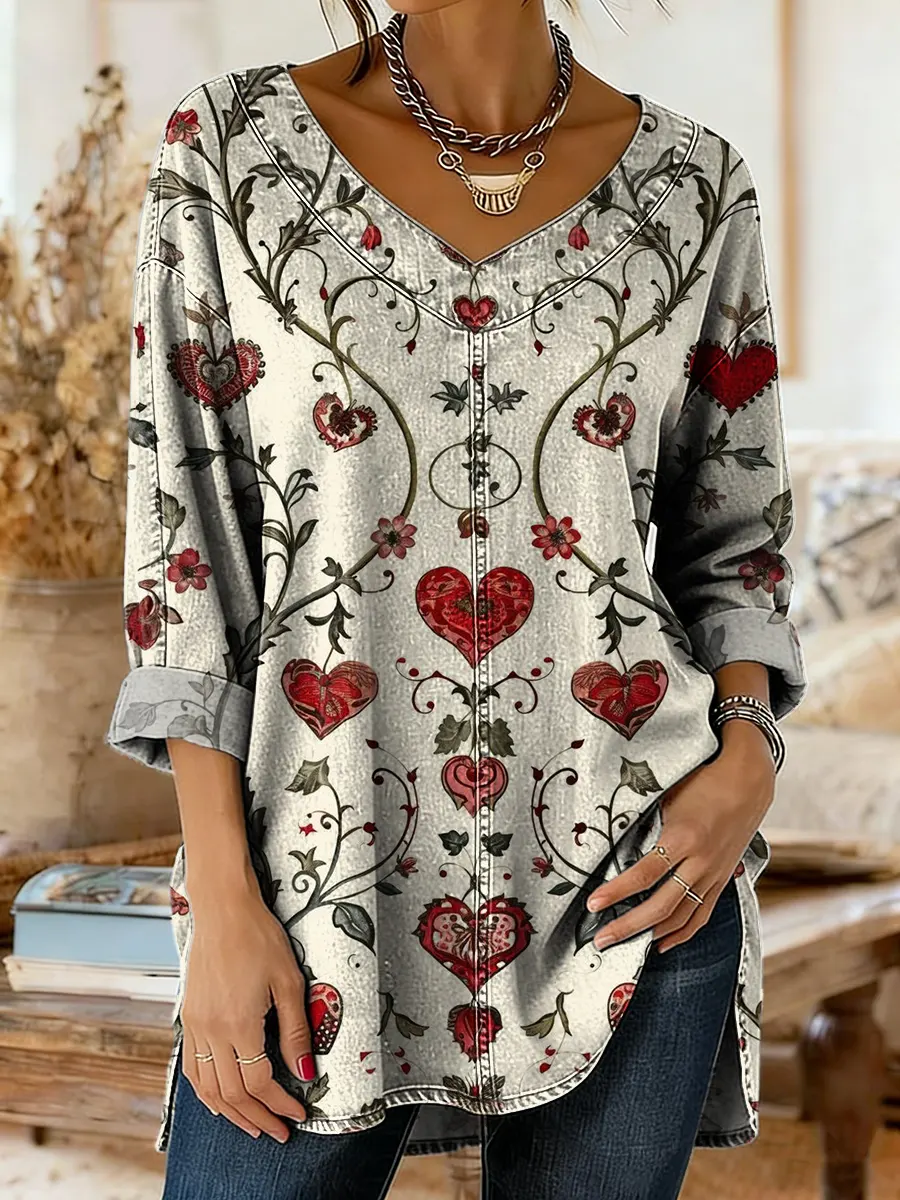 Retro Heart Pattern Art Print Casual Washed Denim Cotton Top
