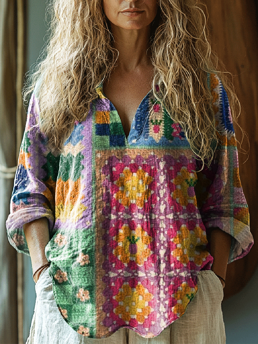 Women's Boho Patchwork Pattern Art Print Casual Linen V-Neck Shirt