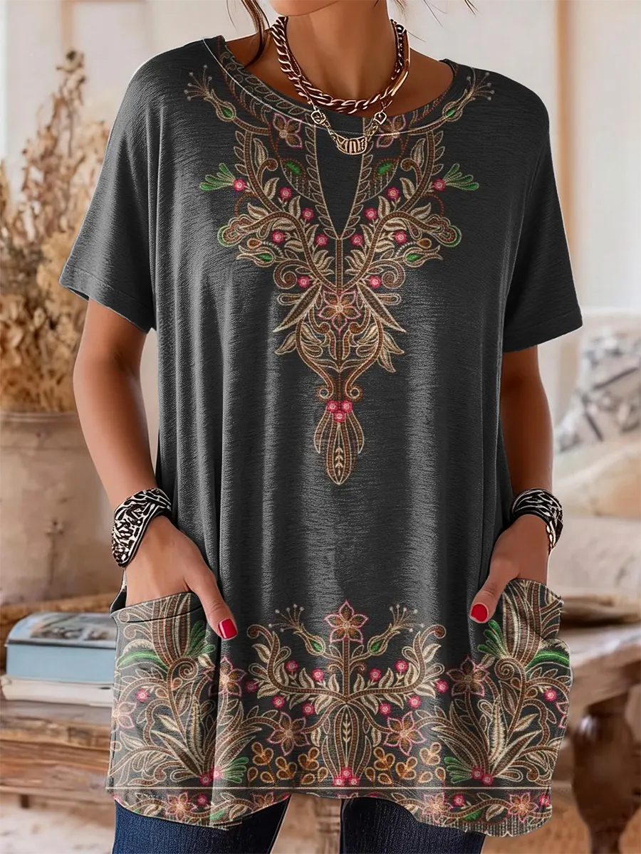 Women's Vintage Floral Pattern Art Print Casual Short-sleeve Crew Neck Pocket Cotton T-shirt